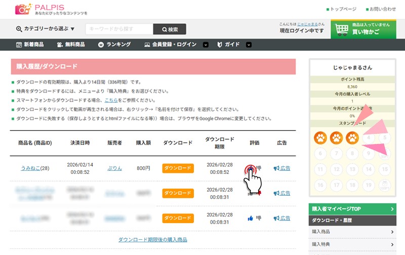 PALPISには、購入した商品の個数に応じてスタンプを獲得できる、スタンプカード機能があります。商品を購入し、その商品を評価することで、スタンプを獲得できます。