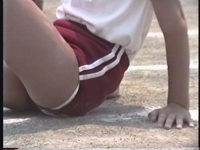 エンジ地に白2本ラインのブルマ。サイドに2本のエンジラインがカワイイ体操着。準備体操の後は徒競争。20分頃からは組体の準備のために入場門に集まってきた裸足っ娘を激撮。「本番」時には見せない自然な表情をお楽しみください。横からのアングルもあります。バッチリシャツ入れブルマを30分過ぎまでじっくりご覧ください。45分頃から、出番待ちでブルマ姿のままくつろぐ娘がカワイイ。