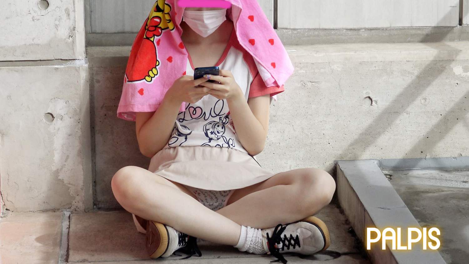 (2)スポセンの風景です。頭にタオルを被った女子が地べたに座りながらスマホをいじってます。最初はあぐらをかいていたのですが途中で体育座りになります。
