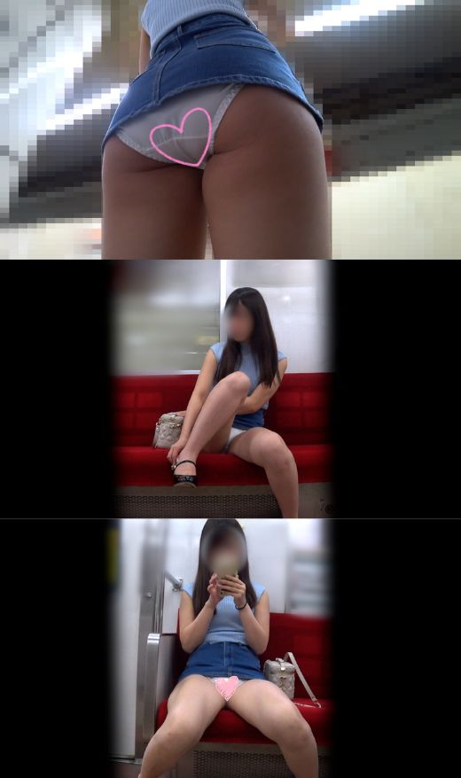彼女が座席に腰を下ろした瞬間です。デニムのミニスカートが太ももの付け根までずり上がり、隠すべきエリアが完全にオープンに。