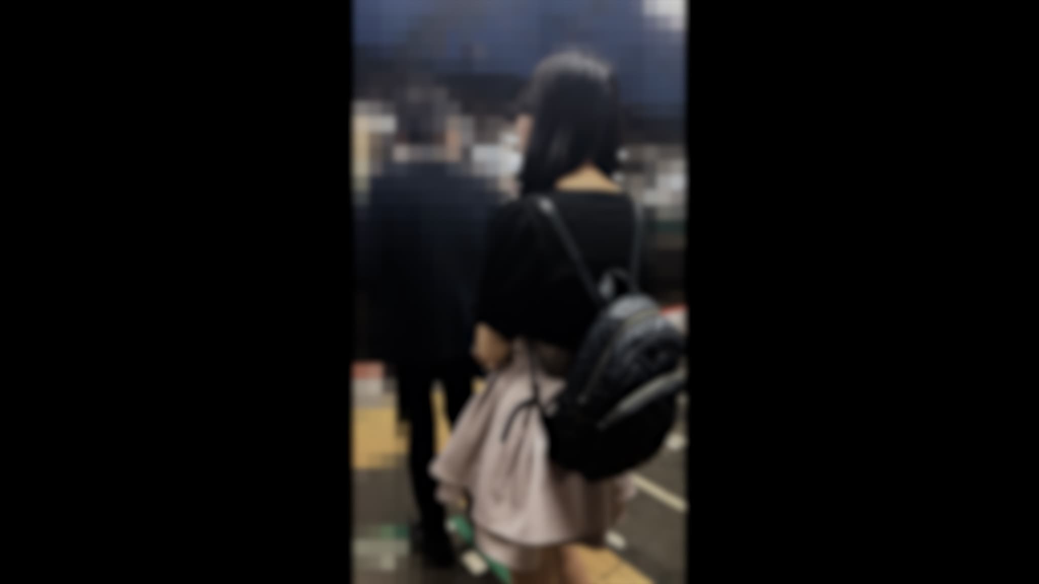 ピンクのスカートに黒のトップス、若者が背負うような小さなリュック。