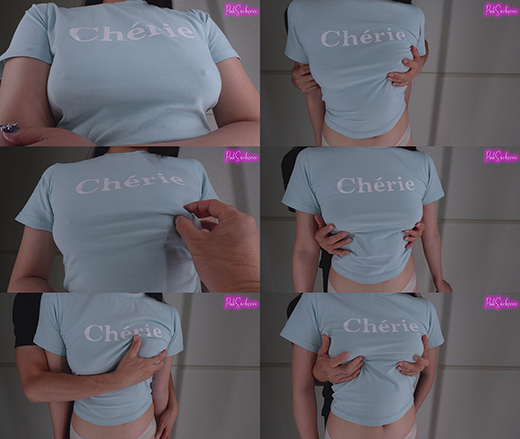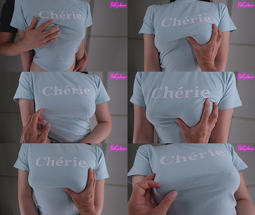 前回の動画で味を占めて、再び薄いTシャツ越しに胸を触る