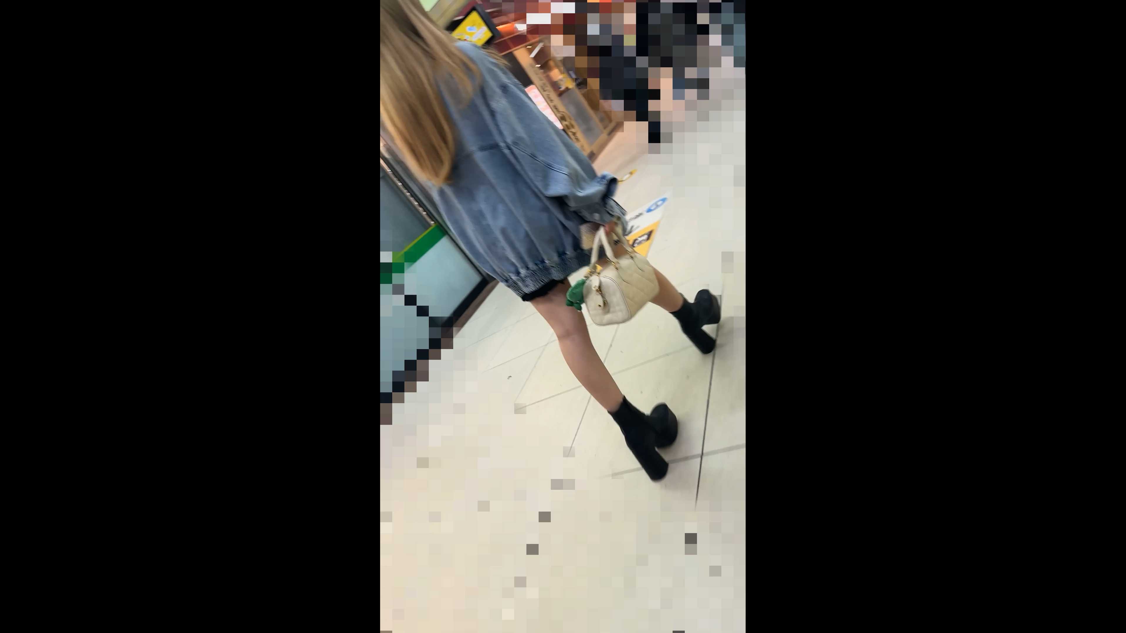・服装:オーバーサイズのデニムジャケット、ミニボトム、厚底ブーツ