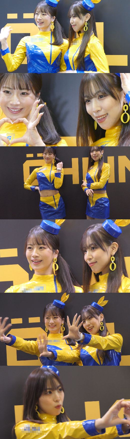 青と黄色エナメルミニスカ美女二人組 へそ出し衣装がエロすぎます