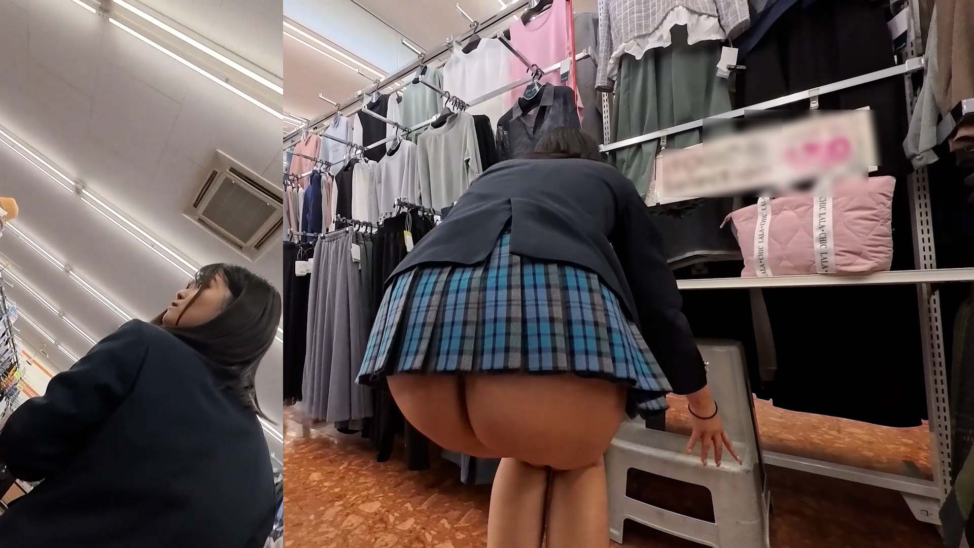 ニーソと黒タイツ制服女子2人が雑談しながら無防備パンチ…ピンクソックス600円 -