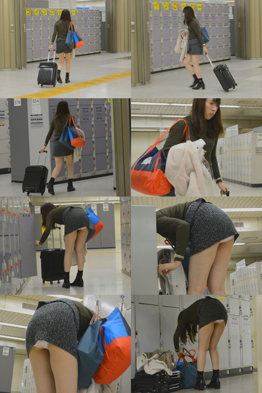 荷物を預けるロッカーを探してウロウロと歩き回っているが、無防備にも前かがみになると短すぎるニットのタイトスカートから清純な薄いピンク色のパンティがお目見え!!