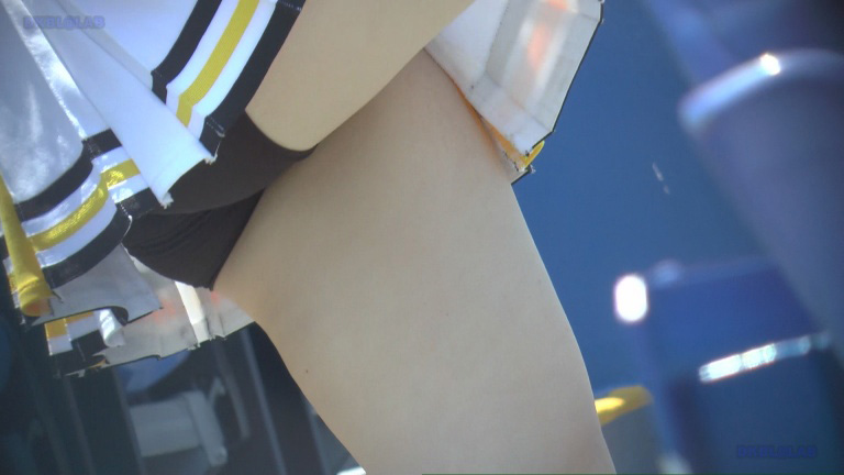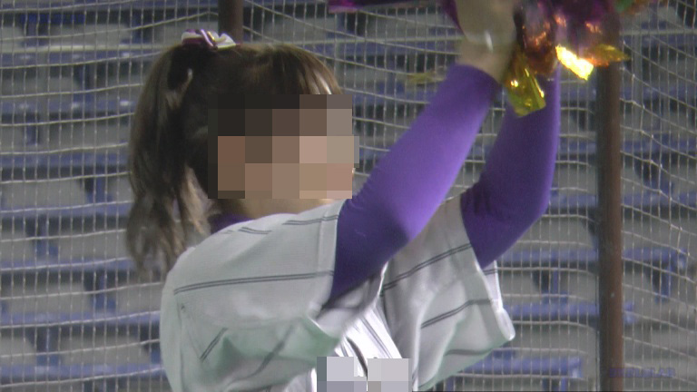 上グレー・白地に紫・黄ラインスコートのチアユニ娘の近接シーンから!