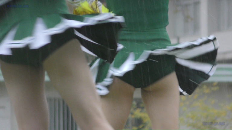 続いて土砂降りの雨の中、白・緑チアユニ娘の応援シーンへ!