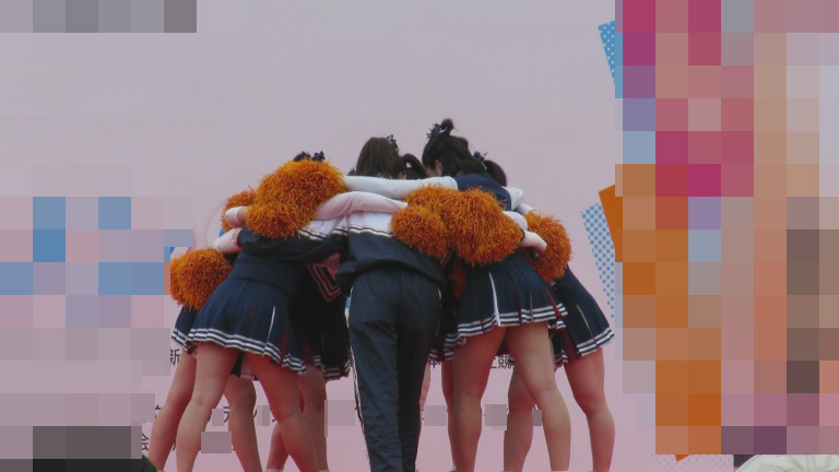 半白下半赤のユニチームの登場、ステージ上で繰り広げられる華やか鮮やかチア演技。