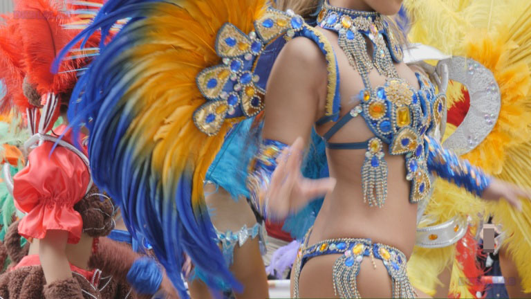 その中を割って入るかのように本場のサンバユニはこれよーといわんばかりにひときわ豪華な羽根をつけたベテランが登場。