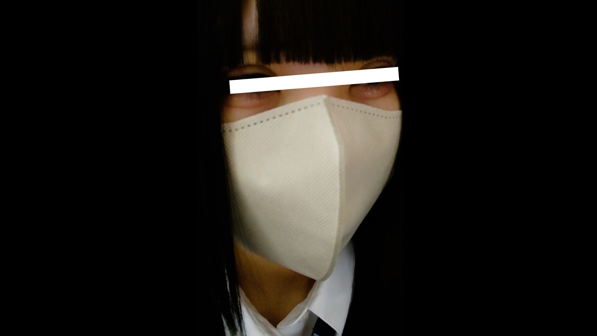 装備: 白色の不織布マスク、足元は黒のローファー。
