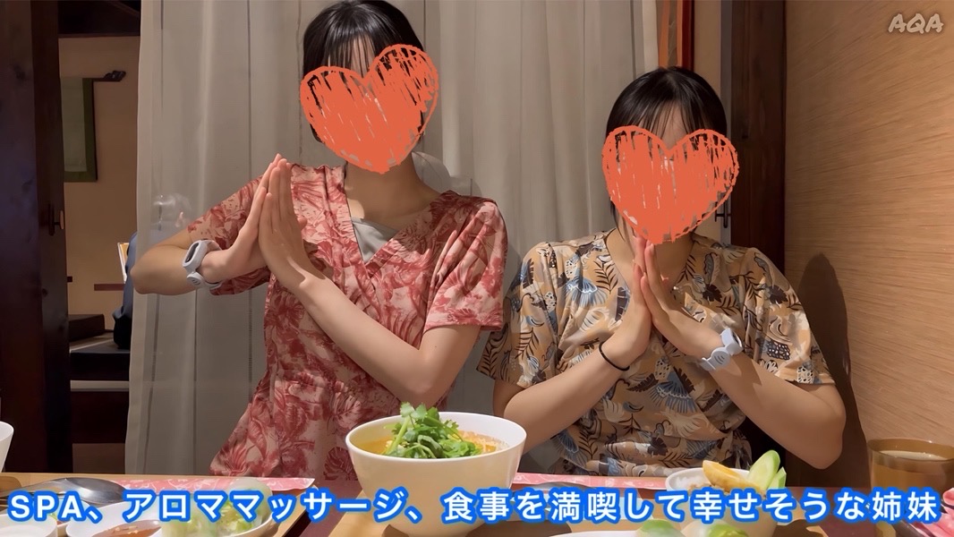 温泉シーンは公衆の男女別のため撮れませんでしたが、SPA施設内のロビーで寛ぐ姿や、アロマエステに行き出す姉妹、美味しそうに食事を楽しむ姉妹、屋上から夜景を楽しむ姉妹を収録しております。